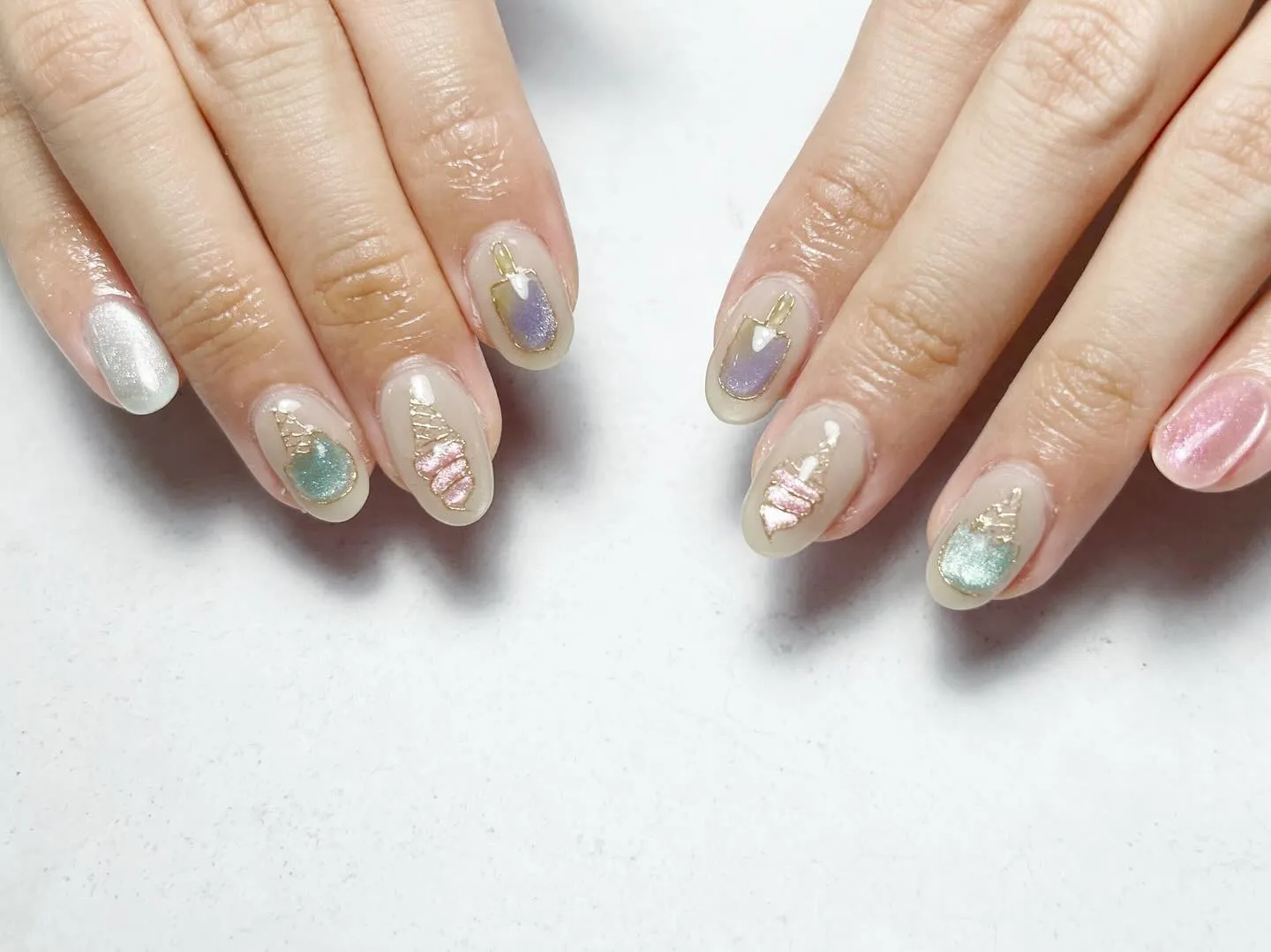 あいしゅくりーむっ🍦🩷 あいしゅくりーむっ🍦🩷.秋の匂いを感じる時もありますけどまだまだ、暑い日が続きますね🥵.かわいいアイスクリームネイルで夏満喫してもらいました🍉.#栄#栄ネイル#アイスクリーム#アイスクリームネイル#ネ…